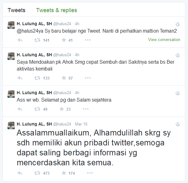 Ya, akun twitter @halus24 memang milik Haji Lulung yang baru saja dibuat. Kalau dilihat, tweet pertamanya baru diluncurkan pada Selasa, 10 Maret 2015. Artinya memang twitter ini bisa jadi baru saja dibuat pada hari itu.
